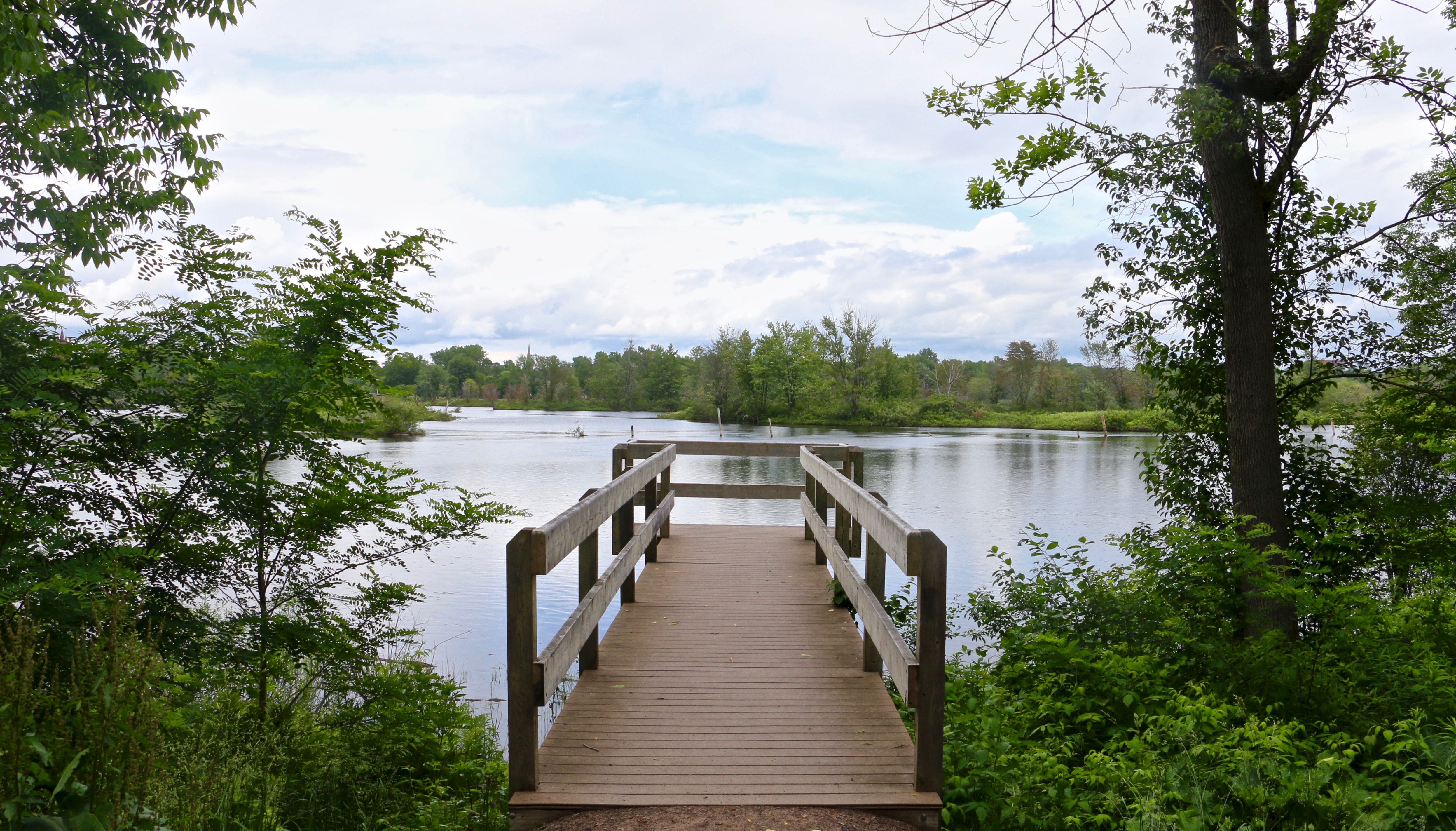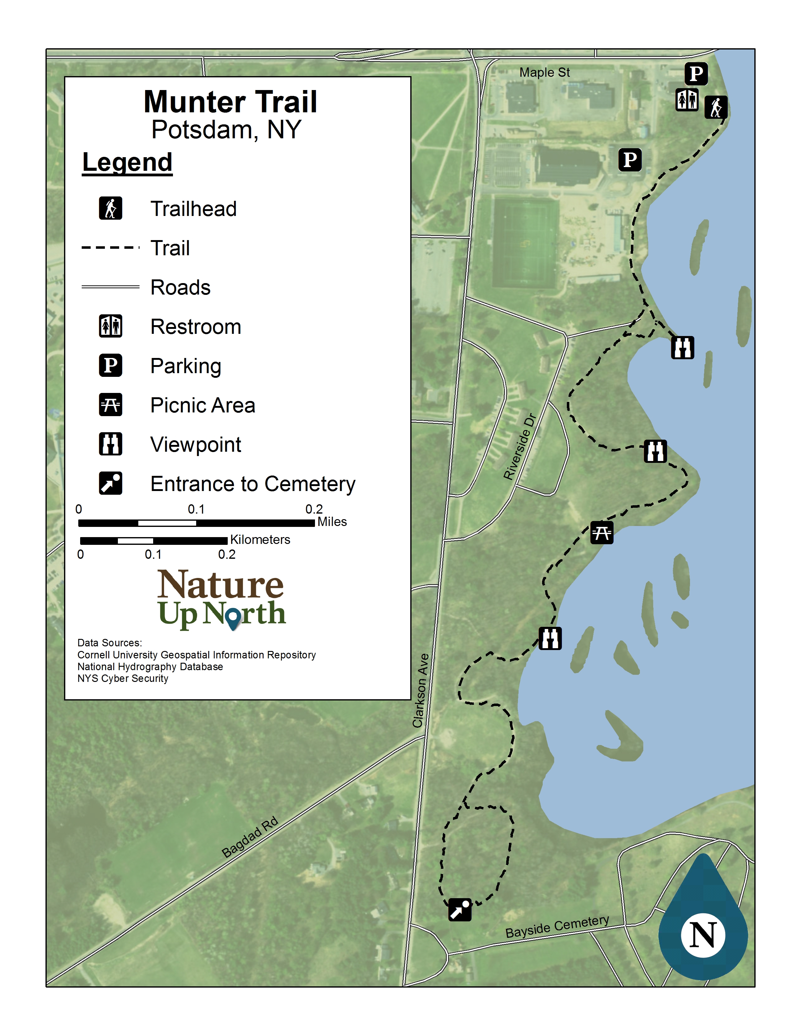 The Munter Trail, part of Clarkson University’s trail system, is a wide, level, packed sand trail that follows the Raquette River south to the entrance of the Bayside Cemetery. Along the trail there are a number of picnic spots, as well as boardwalks perfect for fishing or enjoying the view of Fall Island. The trail can be accessed from a number of points, with the two main trailheads located at the rear of the Stewart’s Shop on Maple St. or behind the Clarkson University Walker Center behind Hantz Field. The closest public restrooms are located at the Stewart’s, a great excuse to pick up a cone of ice cream after your walk.