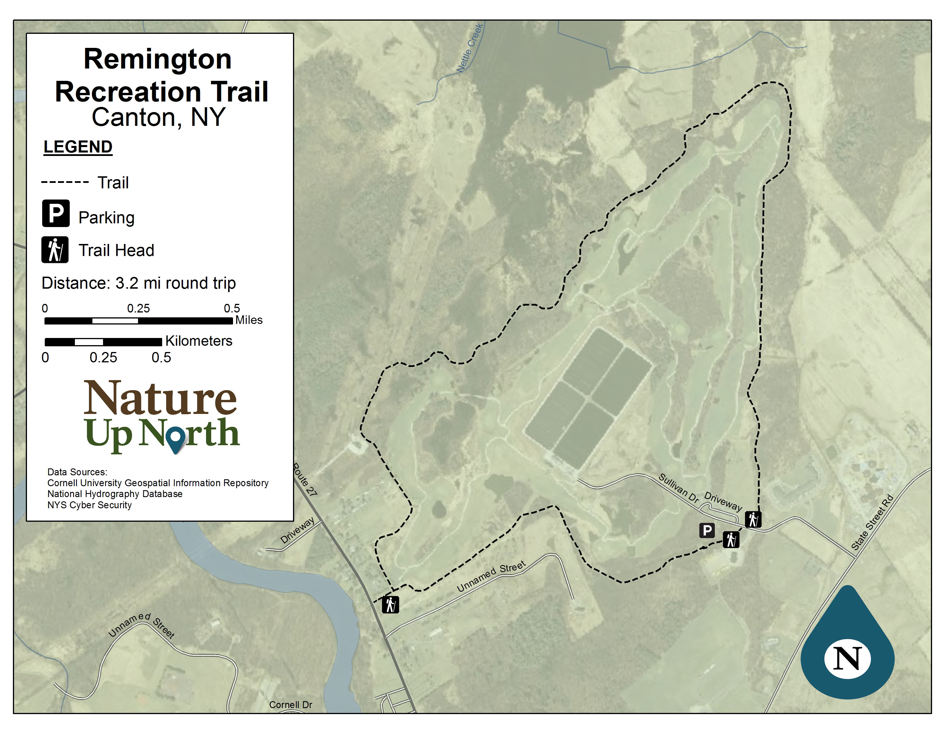 The Remington Trail, also known as the Partridge Loop, is a popular paved 3.2 mile loop that winds its way around the Partridge Run Golf Course. The trail is great for bikers, walkers, roller bladers, and runners. There are two main entry points for the loop, one off Riverside Drive and the other off Sullivan Drive next to the golf course parking lot that doubles as trailhead parking. There is a playground found 0.1 mile from the Sullivan Drive entrance.