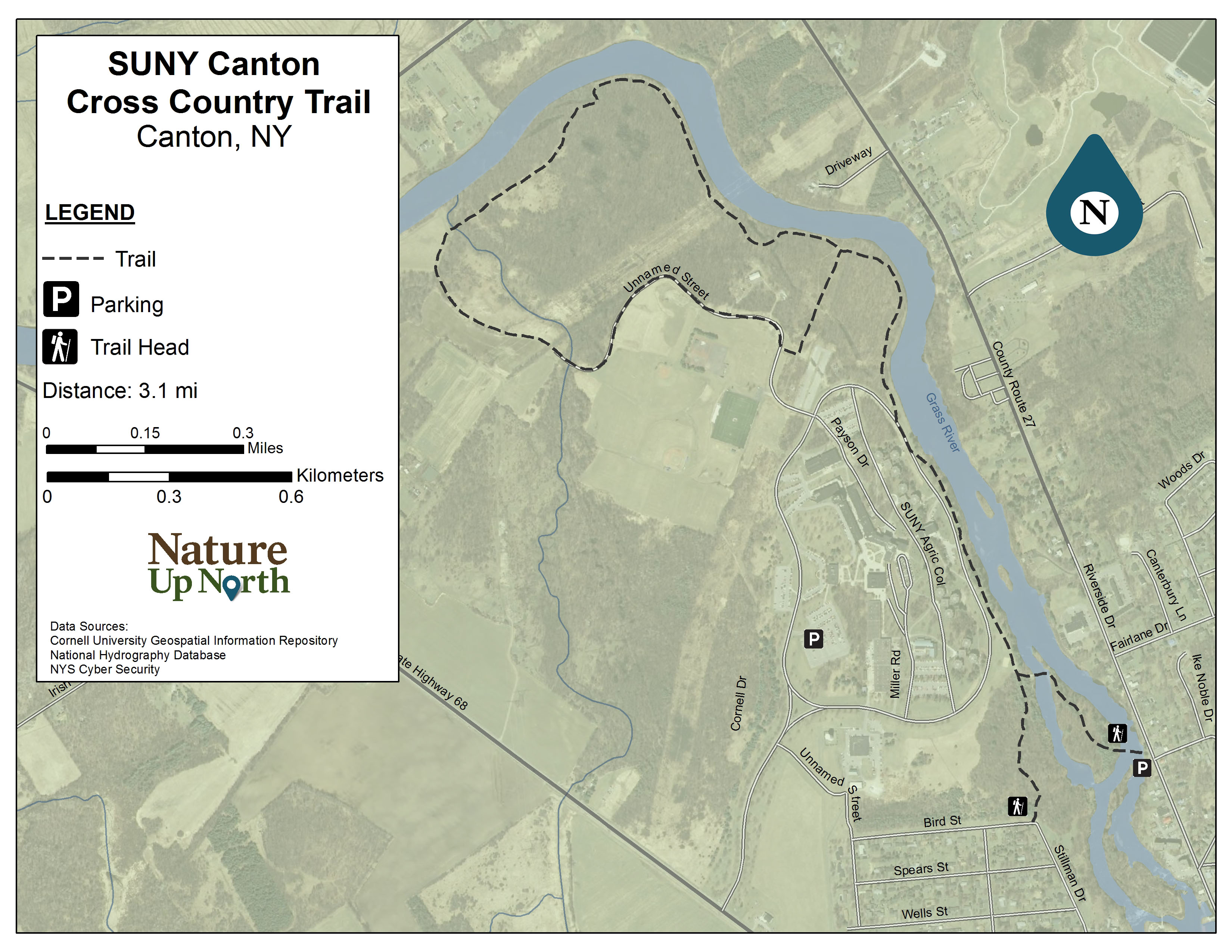 The cross country trail at SUNY Canton is a pleasant, mostly flat path along the Grasse River. It can be accessed from the footbridges over the Grasse off Riverside Drive, behind the Roos House Athletic Center, and from Parking Lot 6 on the SUNY Canton campus. From the footbridges, continue along the paved path, then along grass area between the road and the river until the trail enters the woods, where it is more distinct. In the spring look for an impressive display of trillium in bloom on both sides of the trail as you enter the woods. The trail winds through lowland forest and old field habitats until it eventually emerges behind the athletic fields, where you can go left towards the athletic center or right and around the baseball fields before climbing up to Parking Lot 6. This is also a great trail for cross country skiing in winter.
