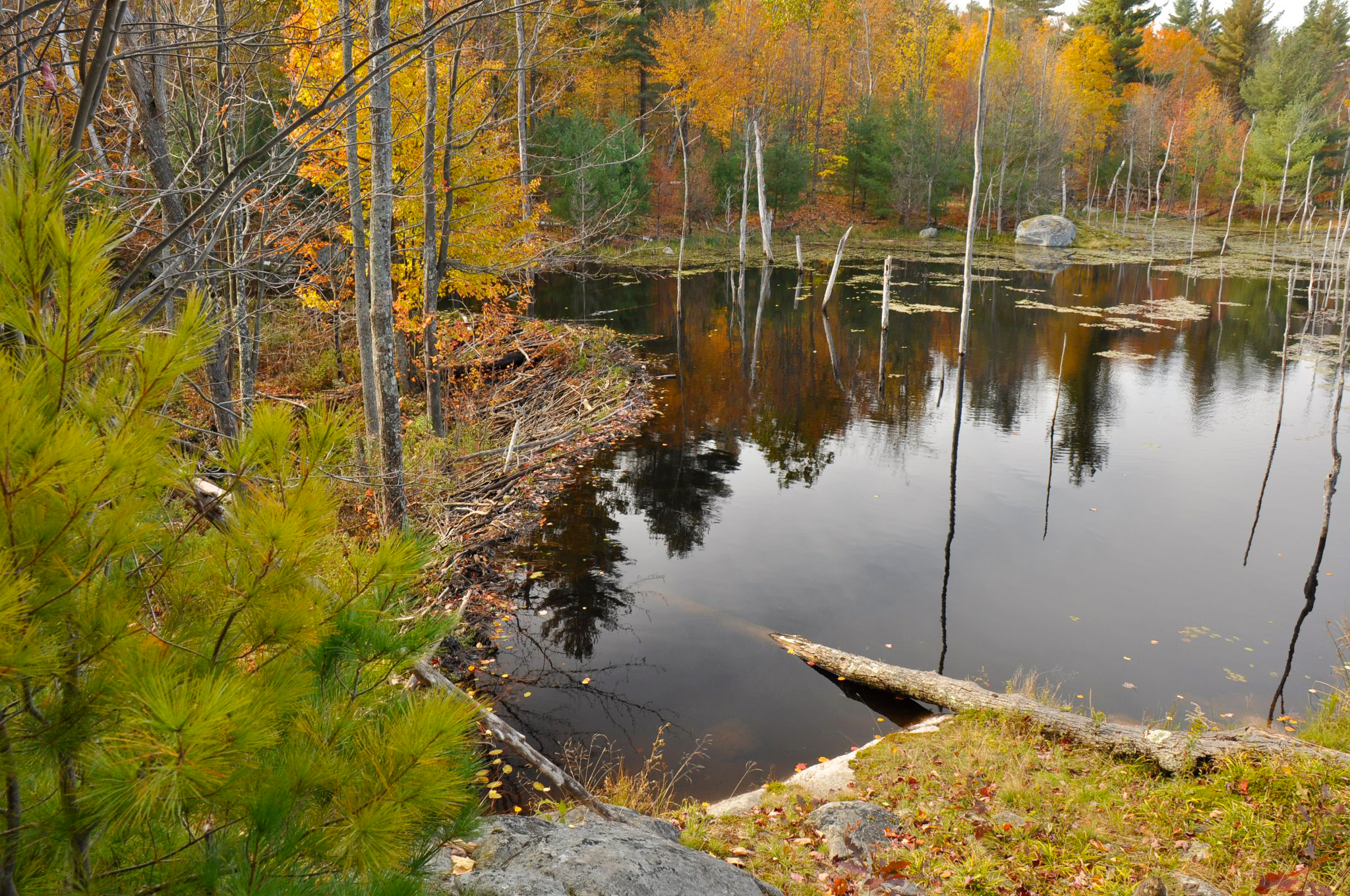 The Wolf Lake State Forest trail system travels through a forested landscape offering great views of the fall foliage and passes by three lakes: Wolf Lake, Moon Lake, and Huckleberry Lake. Many of the trails cross beaver marshes and there is a very large beaver hut on a small pond half way between the southeast Talcville Road entrance and the junction at Moon Lake (blue trail markers). Lean-tos are located on the west side of the Sam Day Road to Moon Lake trail “Beaver Ponds Trail” (red markers) approximately 1.5 miles from the northwest entrance, on the northwest shore of Wolf Lake along the Sam Day Road to Wolf Lake Trail (yellow markers), on the southern shore of Moon Lake and the eastern shore of Huckleberry Lake along the Talcville Road to Moon Lake Trail (yellow markers). Wolf Lake and Huckleberry Lake are well known for their great bass fishing and Wolf Lake is home to many great camping sites.